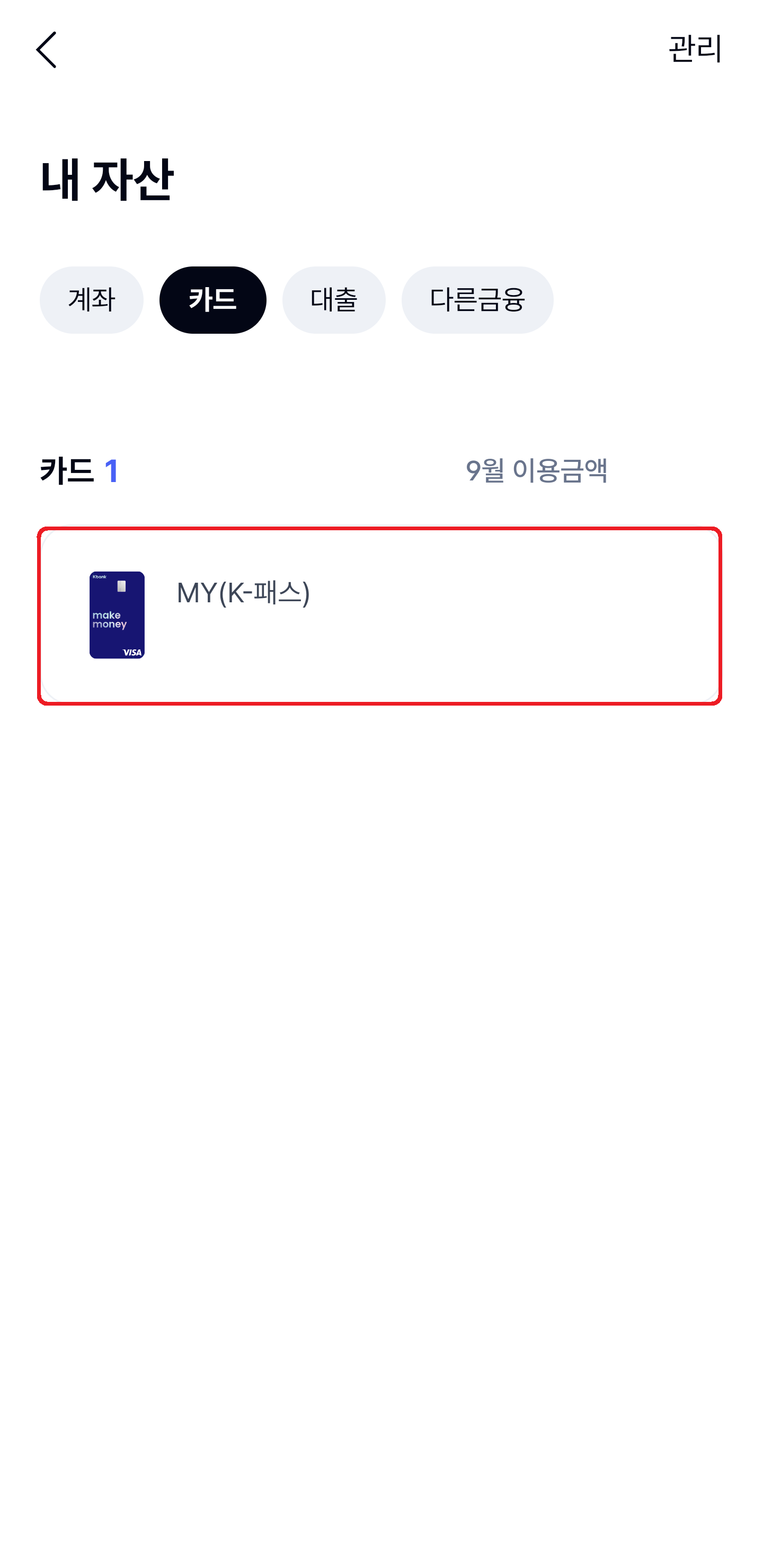 케이뱅크 앱에서 오른쪽 아래의 '전체'를 누르시고, 쭉 아래로 내려보면 '내 카드 조회'라고 있습니다. 저는 여기를 한번 들어갔다 와서 '최근' 항목에 저게 떠 있는 겁니다. 그리고 자신의 케이뱅크 K패스 교통카드를 선택합니다.