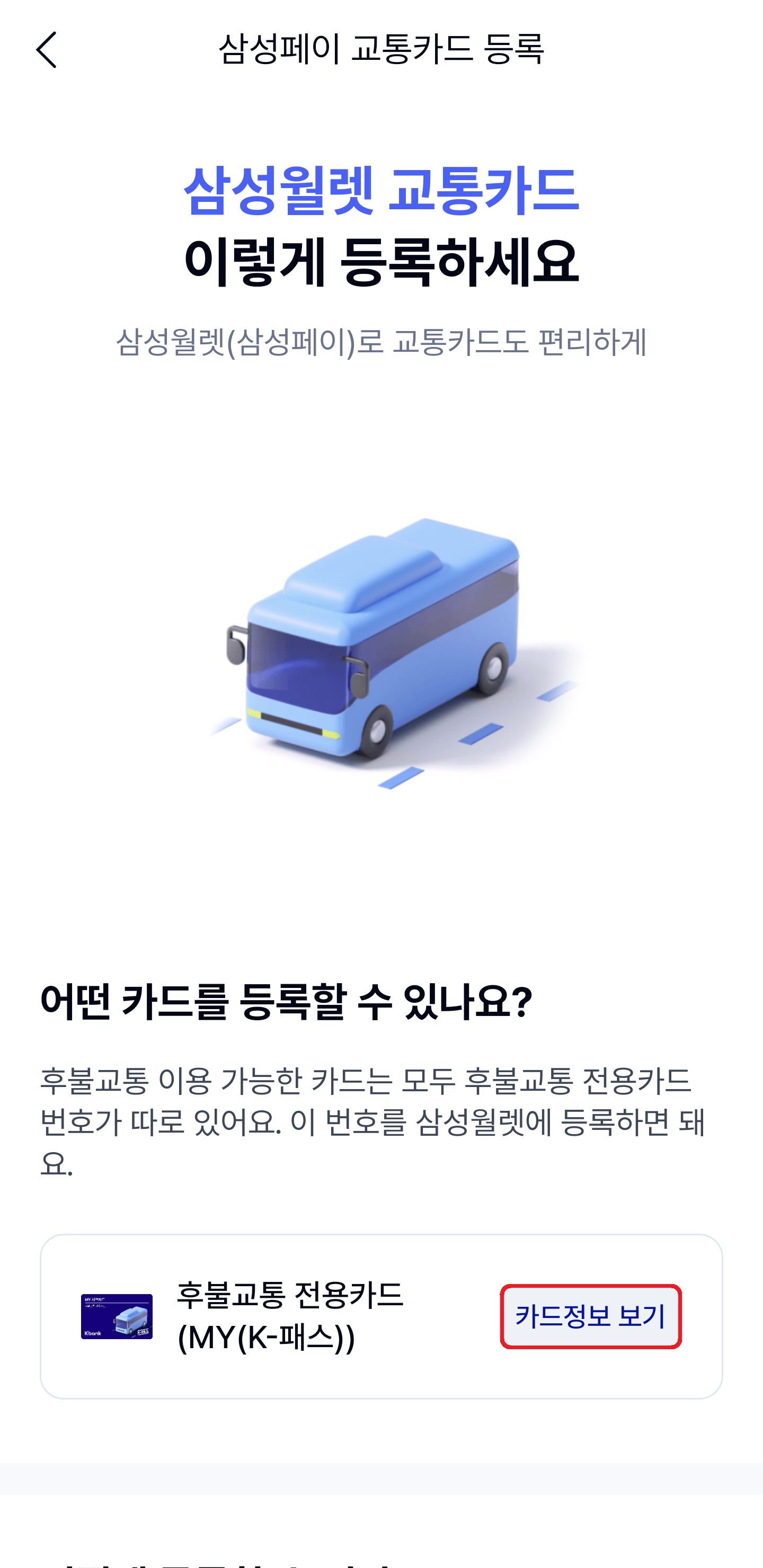 A: 네, MY(K-패스)의 후불교통 전용카드로 삼성월렛 교통에 등록하면 K-패스 혜택을 받을 수 있어요. 단, K-패스 앱에는 MY(K-패스) 체크카드 번호로 등록하셔야 해요.