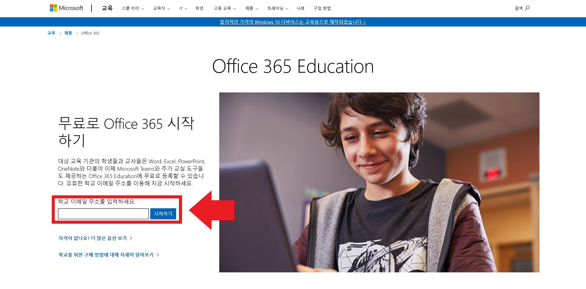 [여기]를 눌러서 교육용 오피스 페이지를 방문해 보시면 위와 같은 화면을 보실 수 있습니다. 그리고 빨간 네모칸에 학교에서 부여 받은 이메일 주소를 입력하면 시작할 수 있습니다. 참고로 학교에서 받은 메일 주소는 @university.ac.kr 처럼 끝이 ac.kr 로 되어 있습니다. 이걸 통해서 학생 혹은 교직원인지 여부를 판별하는 것이라고 생각하시면 됩니다.