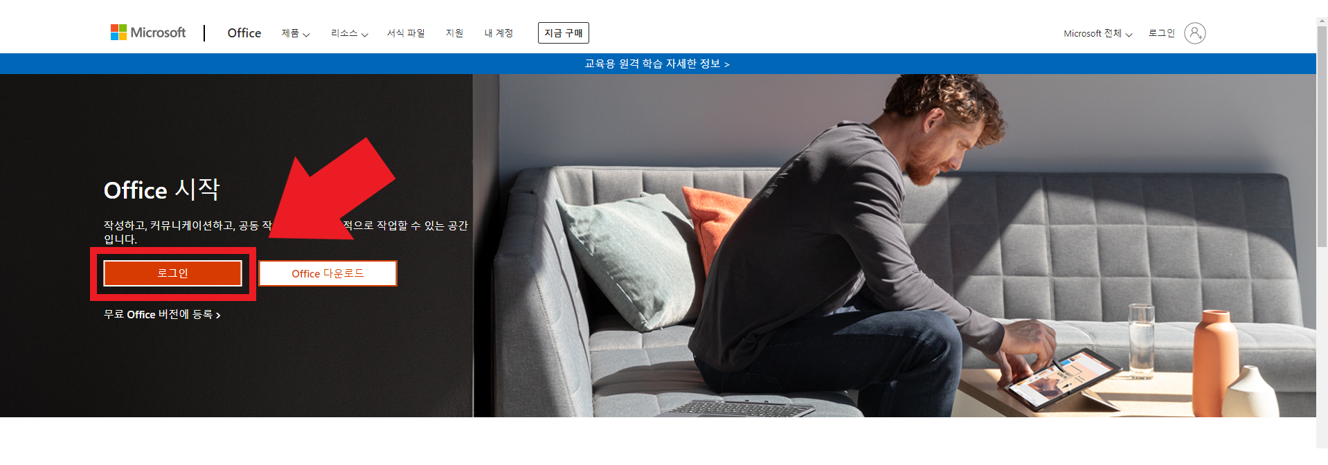 마이크로소프트 오피스 홈페이지로 방문합니다. www.office.com 여기를 누르시면 바로 갈 수 있습니다. 그러면 [로그인] 버튼이 보일 겁니다.