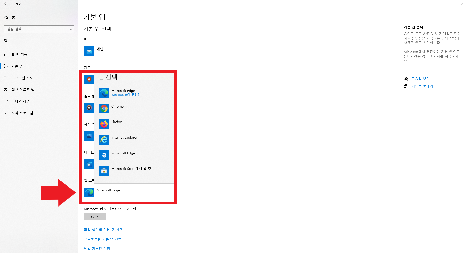 참고: 인터넷 익스플로러는 보안에 매우 취약합니다. 그리고 속도가 느립니다. 핸드폰과 연동도 불가능합니다. 따라서 익스플로러로의 변경은 권장하지 않습니다. 개인적으로는 엣지를 기본으로 두고 쓰거나, 원하면 크롬이나 파이어폭스 등으로 변경하는 걸 권장합니다. 다시 한번 강조하지만 인터넷 익스플로러는 권장하지 않습니다.