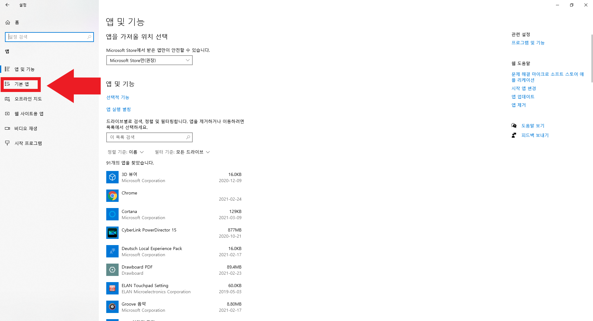그리고 왼쪽의 [기본 앱] 탭을 눌러 줍니다. 그러면 아래와 같이 종류별로 기본 앱을 설정할 수 있는 옵션이 나옵니다.