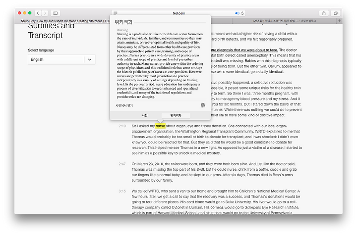 트랙패드에서 세 손가락으로 터치하면 해당 단어의 뜻과 위키백과 검색 내용을 보여줍니다.