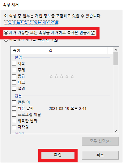이 [자세히] 탭의 맨 아래를 보면 [속성 및 개인정보 제거]라는 부분이 보일 겁니다. 여기를 누르고, [제거 가능한 모든 속성을 제거하고 복사본 만들기]를 선택, 그리고 [확인]을 누르면, 같은 파일의 복사본이 생성 됩니다.