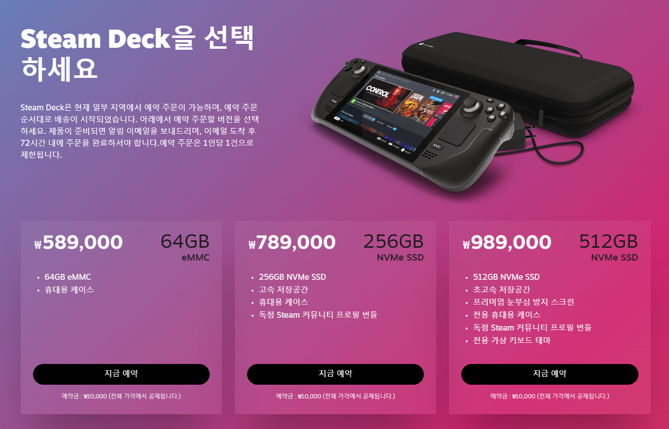 Steam Deck을 선택하세요 Steam Deck은 현재 일부 지역에서 예약 주문이 가능하며, 예약 주문 순서대로 배송이 시작되었습니다. 아래에서 예약 주문할 버전을 선택하세요. 제품이 준비되면 알림 이메