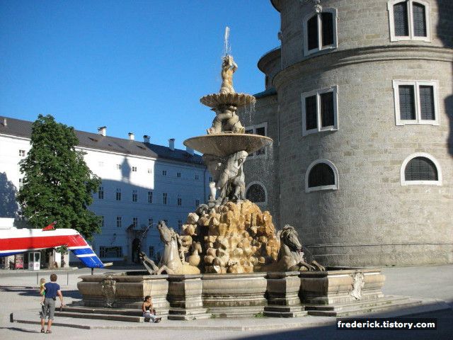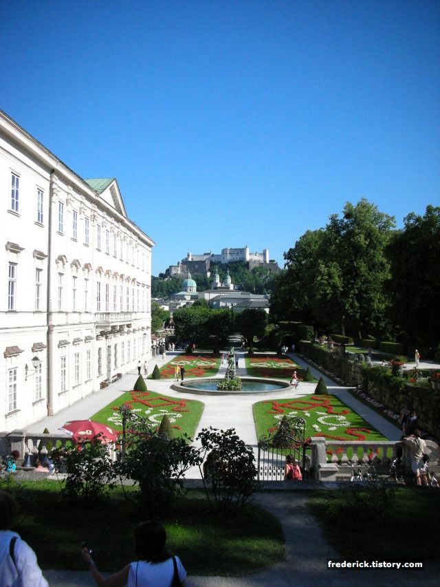여기가 바로 잘츠부르크에서 한번씩은 꼭 지나가는 미라벨 궁전입니다. 그리고 저 뒤로 산 꼭대기에 있는 것이 Festung Hohensalzburg (호엔잘츠부르크 요새) 입니다- 여기서 보면 Schloss (Castle / Palace) 하고 Festung 을 둘 다 성이라고 해놓은 곳이 있는데 Festung은 전쟁 방어 목적으로 세운 요새 등을 가리키는 말이므로 호엔잘츠부르크 성 혹은 요새라고 하되 전혀 다른 목적으로 지어진 것임을 알아두면 이해하는데 더 좋겠죠-