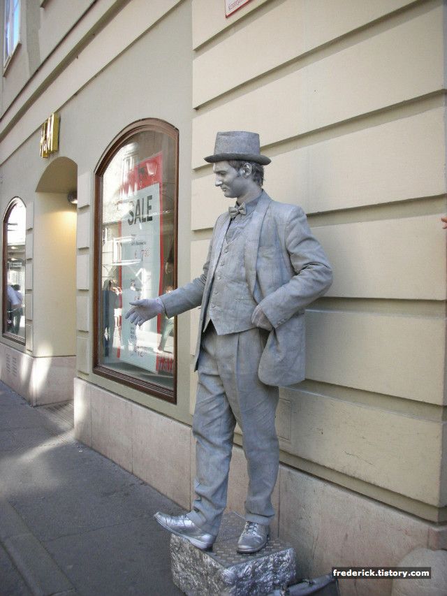 유럽에서는 거의 어디서나 길거리 퍼포먼스를 관람할 수 있습니다- 클래식 악기를 가져와서 연주하는 팀도 있고, 밤에 불을 가지고 묘기를 하는 사람도 있고, 아니면 사진에서 보는 것처럼 분명 사람이지만 꼼짝않고 서서 동상인척 하는 경우도 있습니다 :) 앞에 돈통에 돈을 넣을 때가 되면 잠시 움직여줍니다 ㅎ 아니면 기념 사진 촬영할때 특이한 표정을 지어주거나 하고, 다시 원래 모습으로 돌아오죠-ㅋ 100% 사람입니다 기계 아닙니다 ^-^;;