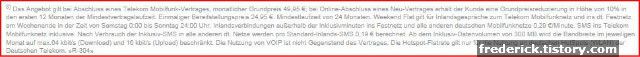 가입비 24,95 EUR 별도, 데이터 사용의 양은 제한이 없지만 월 사용량이 300메가를 초과하는 경우 그 때부터는 다운로드는 최고속도 64kbit/s, 업로드는 16kbit/s 로 제한이 걸립니다. VOIP 사용 또한 계약에 포함되지 않습니다. 즉, 사용하면 계약 위반입니다.