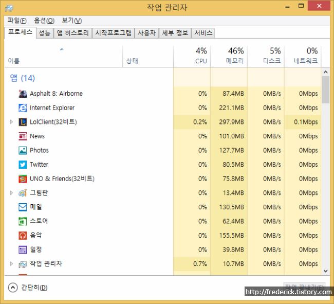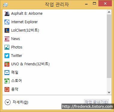 이렇게 하면 앱이 종료가 되었습니다. 그런데 윈도우 8.1 에서는 동일한 방법으로도 앱을 종료할 수 있지만 반쪽짜리 종료가 됩니다.